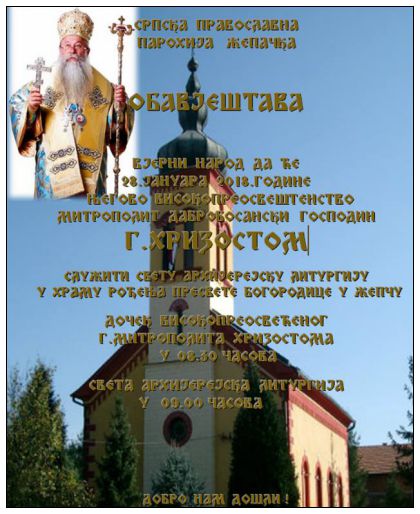 Данас је у четвртак, 4. јануара 2018. године, Његово Високопреосвештенство Господин Хризостом, Митрополит дабро-босански, упутио своју прву митрополитску поруку за Божић 2017 (2018). године. Бројни новинари и ТВ сниматељи окупили су се у зграду митрополије у Сарајаву и тачно 12:00 часова Високопреосвећени је упутио своју поруку преко елекронских медија.