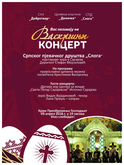 Ове године Српско пјевачко друштво Слога из Сарајева прославља 130 година постојања. Тим поводом, 11. децембра 2018. године приређен је свечани концерт у велелепној дворани Народног позоришта у Сарајеву, у којој Слога има дугу традицију наступања. У препуној сали концерту су присуствовали и представници политичког и културног живота земље, као и представници дипломатског кора.