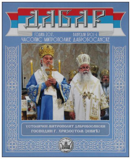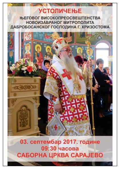 Митрополија дабробосанска, обавјештава сву пуноћу Цркве Божије, да ће се у Недељу 03. септембра 2017. године у храму Рођења Пресвете Богородице у Сарајеву - Саборна црква, обавити свечано устоличење и увођење у трон Митрополита дабробосанских 61. по реду Митрополита дабробосанског Господина Господина ХРИЗОСТОМА. 0.08.2017. ВАНДАЛИ ОСКРНАВИЛИ ХРАМ СВЕТОГ ПРОРОКА ИЛИЈЕ Храм Светог пророка Илије у сарајевској општини Илијаш оскрнављен је током ноћи 8. августа, а оштећени су и Светосавски дом, помоћни објекти, као и расвјета у порти храма, потврдио је парох илијашки јереј Божидар Тановић. 10.08.2017. ЧЕТРДЕСЕТ ГОДИНА СВЕШТЕНИЧКЕ СЛУЖБЕ
