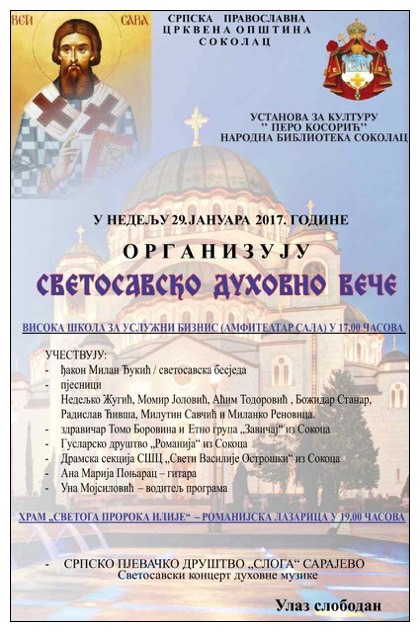 Празник Светог Саве, првог српског Архиепископа и Просветитеља свечано је прослављен у храмовима Митрополије дабробосанске 25.01.2017 НАЈАВА СВЕТОСАВСКИХ АКАДЕМИЈА У МИТРОПОЛИЈИ ДАБРОБОСАНСКОЈ СОКОЛАЦ