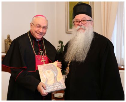 26.12.2017. МИТРОПОЛИТ ХРИЗОСТОМ НА БОЖИЋЊЕМ ПРИЈЕМУ КОД КАРДИНАЛА ПУЉИЋА Поводом Божића по грегоријанском календару Његова узоритост кардинал Винко Пуљић приредио је, данас у уторак, 26. децембра 2017. године, пригодан пријем у Свећеничком дому у Сарајеву. 25.12.2017. НЕДЈЕЉА ПРАОТАЦА У САРАЈЕВУ Недјеља светих праотаца - Аврама, Исака, Јакова и свих осталих вјером Богу угодивших данас је, 24. децембра 2017. године свечано прослављена у Саборном храму Рођења Пресвете Богородице у Сарајеву. Свету архијерејску литургију служио је Високопреосвећени митрополит дабро-босански г.г. Хризостом, а саслуживали су му протојереји: Миомир Зекић, Јадран Даниловић, Владимир Ступар, Вања Јовановић и Илија Чупић те ђакони Милан Ђукић и Будимир Гардовић. У току свете литургије Високопреосвећени Господин Митрополит рукоположио је у чин презвитера (свештеника) ђакона Милана Ђукића, службеника ЕУО-ра на Сокоцу. 23.12.2017. МИТРОПОЛИТ ХРИЗОСТОМ У АНДРИЋГРАДУ