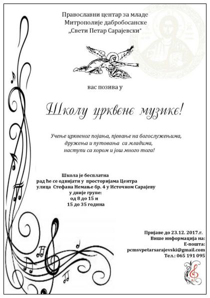 Поводом радосних празника којима се приближавамо, Његово високопреосвештенство Митрополит дабробосански Г. Хризостом ће у петак 22. децембра 2017. г. у 19 часова у Великој биоскопској сали у Андрићграду у организацији СПЦ Вишеград, одржати предавање на тему: „Рођење Богочовека Христа и тајна спасења“. 18.12.2017. ОТВОРЕНЕ ПРИЈАВЕ ЗА ШKОЛУ ЦРКВЕНЕ МУЗИКЕ ПРИ ПРАВОСЛАВНОМ ЦЕНТРУ ЗА МЛАДЕ МИТРОПОЛИЈЕ ДАБРОБОСАНСКЕ