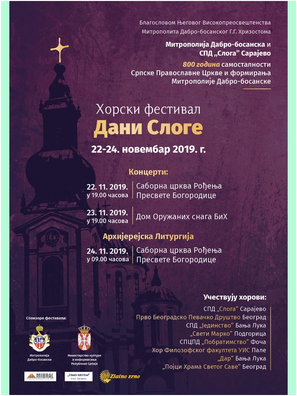 Благословом Високопреосвећеног митрополита дабробосанског Господина Хризостома и под његовим покровитељством, а у организацији СПД ''Слога'' из Сарајева и ЦО Сарајево - саборна црква, одржан је хорски фестивал СПД ''Слога'' од 22. до 24. новембра 2019. године у Сарајеву. Хорски фестивал је конципиран и замишљен као завршна митрополијска манифестација овогодишњег обиљежавања 800-годишњег јубилеја аутокефалности СП Цркве и креирања митрополије Дабро-босанске (1219-2019).