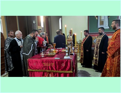 На светој литургији Његовом Високопреосвештенству саслуживали су: свештеноигуман Георгије Станковић, намјесник манастира Озерковићи, јеромонах Владимир Ђуричић, намјесник манастира Кнежина, јереји Немања Лакић и Томислав Пајевић, те ђакон Будимир Гардовић. На крају Свете литургије Високопреосвећени митрополит Хризостом преломио је колач и осветио кољиво у славу и част Светог Јована Златоустог.