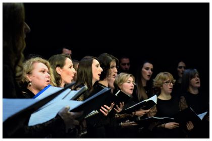 У првом дијелу програма била је заступљена духовна музика православног културног простора. Након извођења композиција Тијело Христово, Хвалите имја Господње и Достојно јест отпјевано је и дјело Дефте лаи, један од најстаријих сачуваних записа средњовјековне црквене музике. На репертоару су се нашли и Мокрањчеви Фрагменти из Литургије Светог Јована Златоустог, као и његово Тебе појем – најизвођеније дјело српске православне црквене музике. Ријеч је о својеврсном омажу великом српском композитору, који је долазио у Сарајево и коме је сарајевска Слога својевремено приређивала свечани дочек. Овај дио програма завршен је композицијом Христос воскресе Корнелија Станковића. Потом је услиједила пројекција изврсног документарног филма о Српском пјевачком друштву Слога, у продукцији Зорана Кубуре и БХРТ.